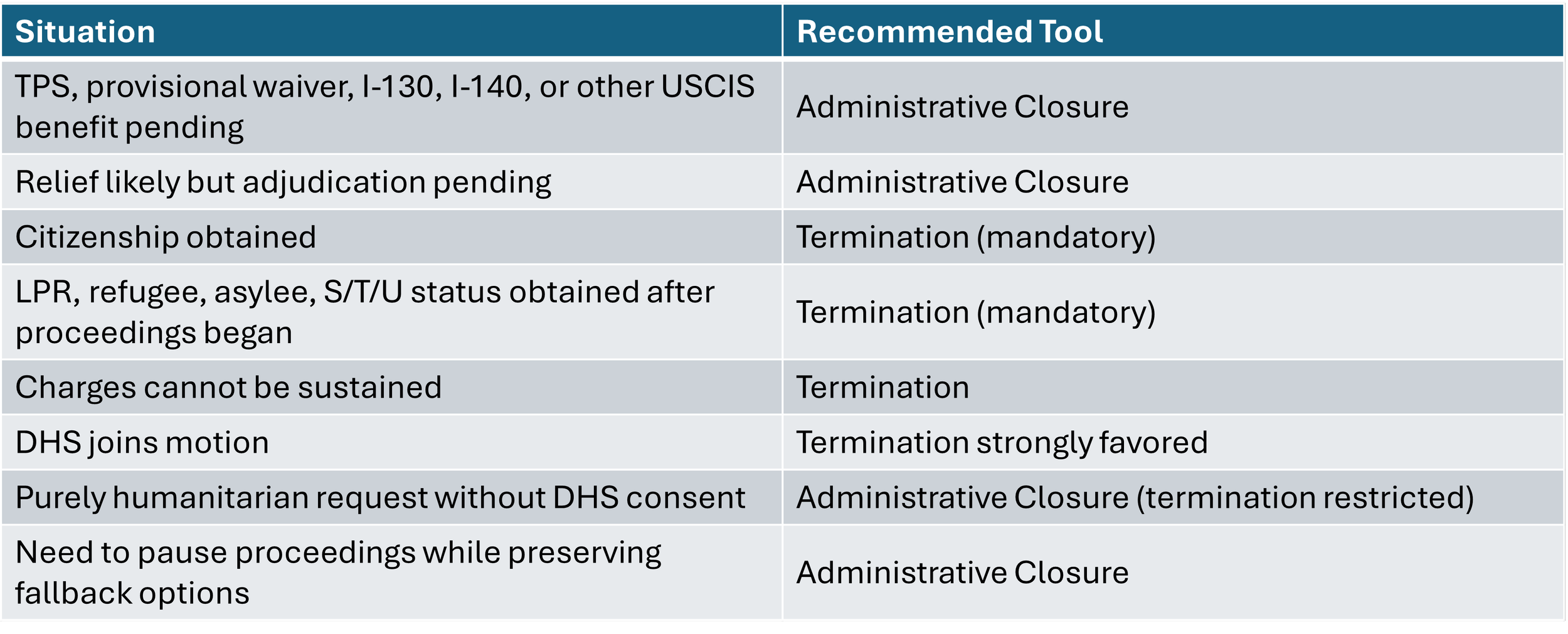 Administrative closure and termination are powerful tools — but they serve different purposes and carry different risks. Choosing the wrong strategy can cost leverage, delay relief, or create avoidable complications.